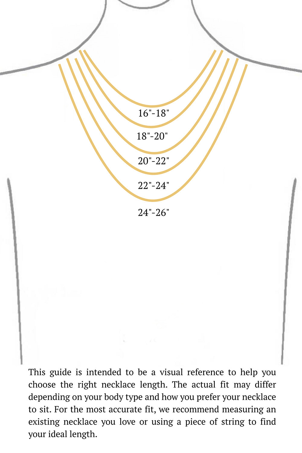 The guide is intended to be a visual reference to help you choose the right necklace length. The actual fit may differ depending on your body type and how you prefer your necklace to sit. For the most accurate fit, we recommend measuring an existing necklace you love or using a piece of string to find your ideal length.